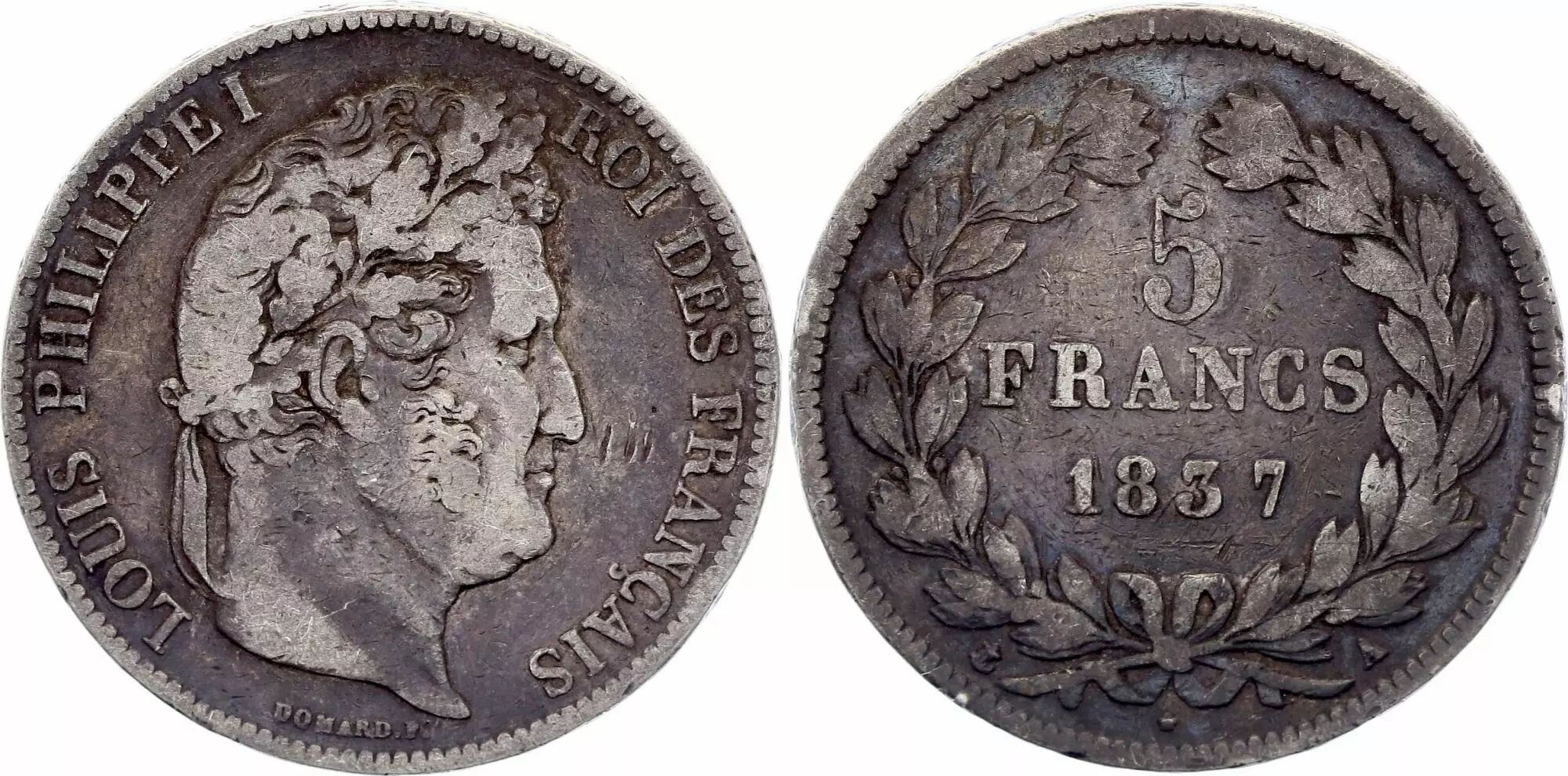 Home > > France 5 Francs Louis-Philippe I - 1837 A Paris - Silver