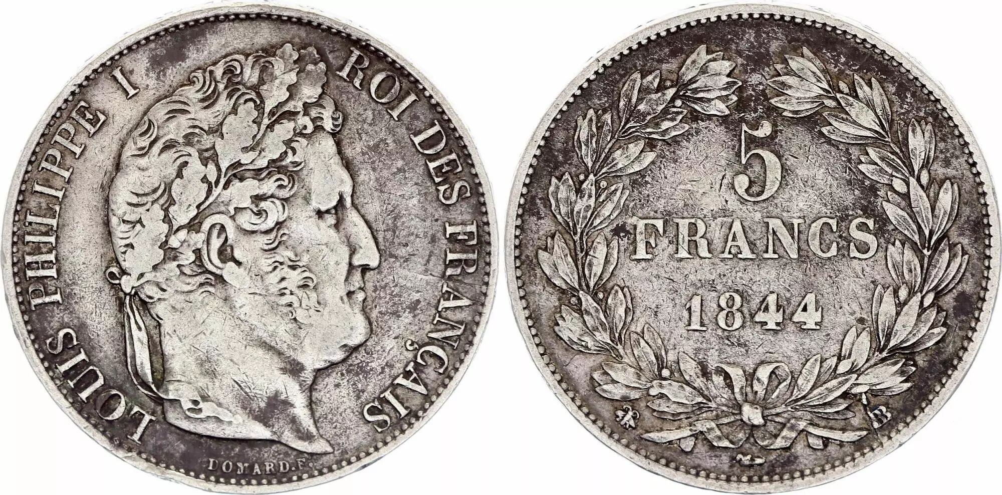 Pièce France 5 Francs Louis-Philippe I - 1844 BB Strasbourg - Argent