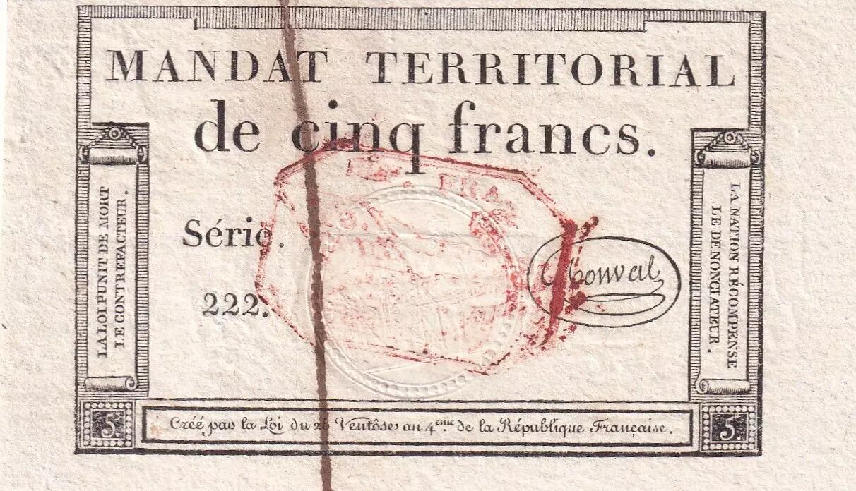 Accueil > Archivage > France 5 Francs Mandat Territorial - 28 Ventose An IV (18.3.1796) - Cachet Rouge