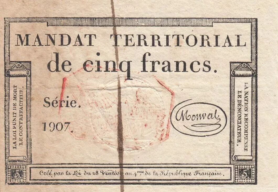 Home > French Banknotes > Assignats > France 5 Francs - Mandat Territorial - 28 Ventose de l'an 4 - Serial 1907 - Red stamp