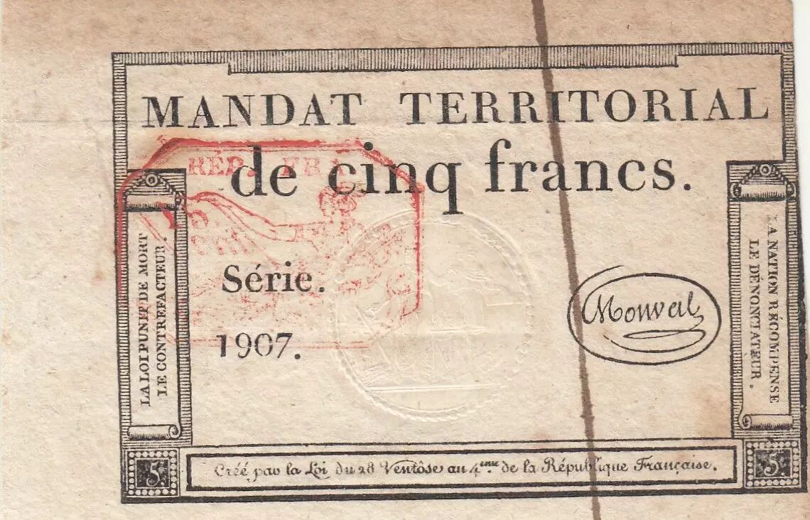 Home > French Banknotes > Assignats > France 5 Francs - Mandat Territorial - 28 Ventose de l'an 4 - Serial 1907 - Red stamp