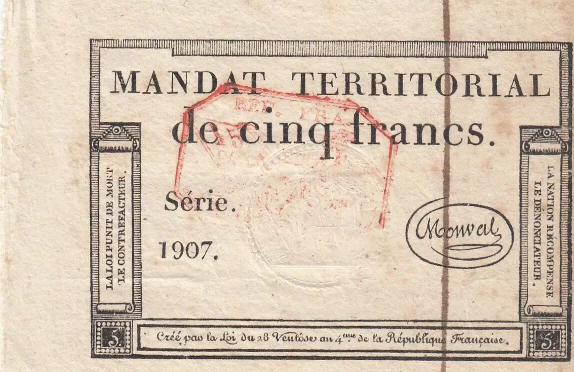 Accueil > Billets Français > Assignats > France 5 Francs - Mandat Territorial - 28 Ventose de l'an 4 - Série 1907 - Cachet Rouge
