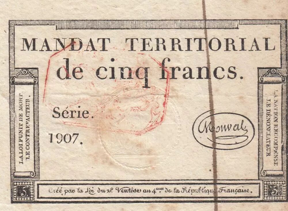 Accueil > Billets Français > Assignats > France 5 Francs - Mandat Territorial - 28 Ventose de l'an 4 - Série 1907 - Cachet Rouge
