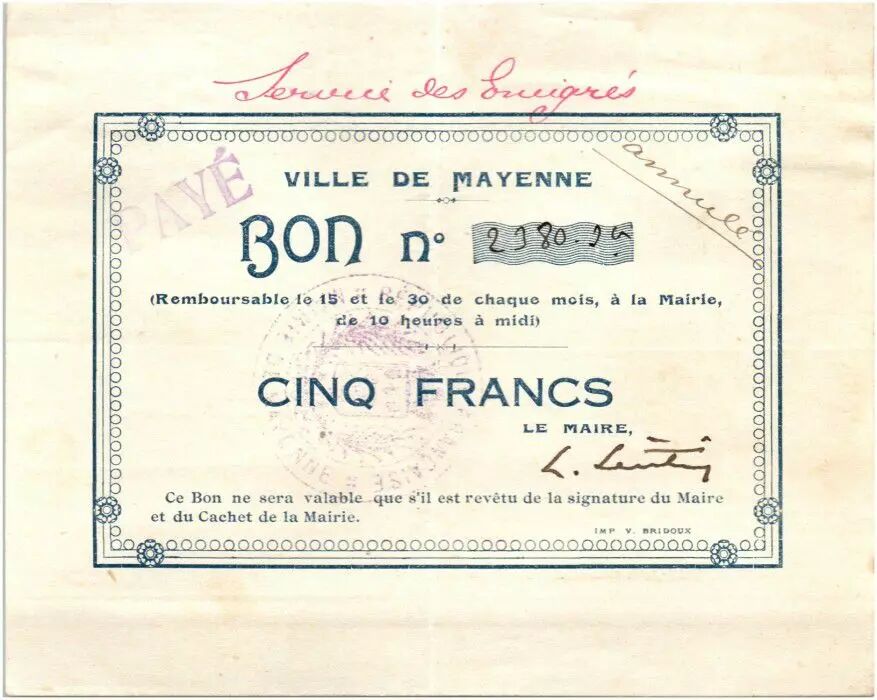 Banknote France 5 Francs Mayenne City