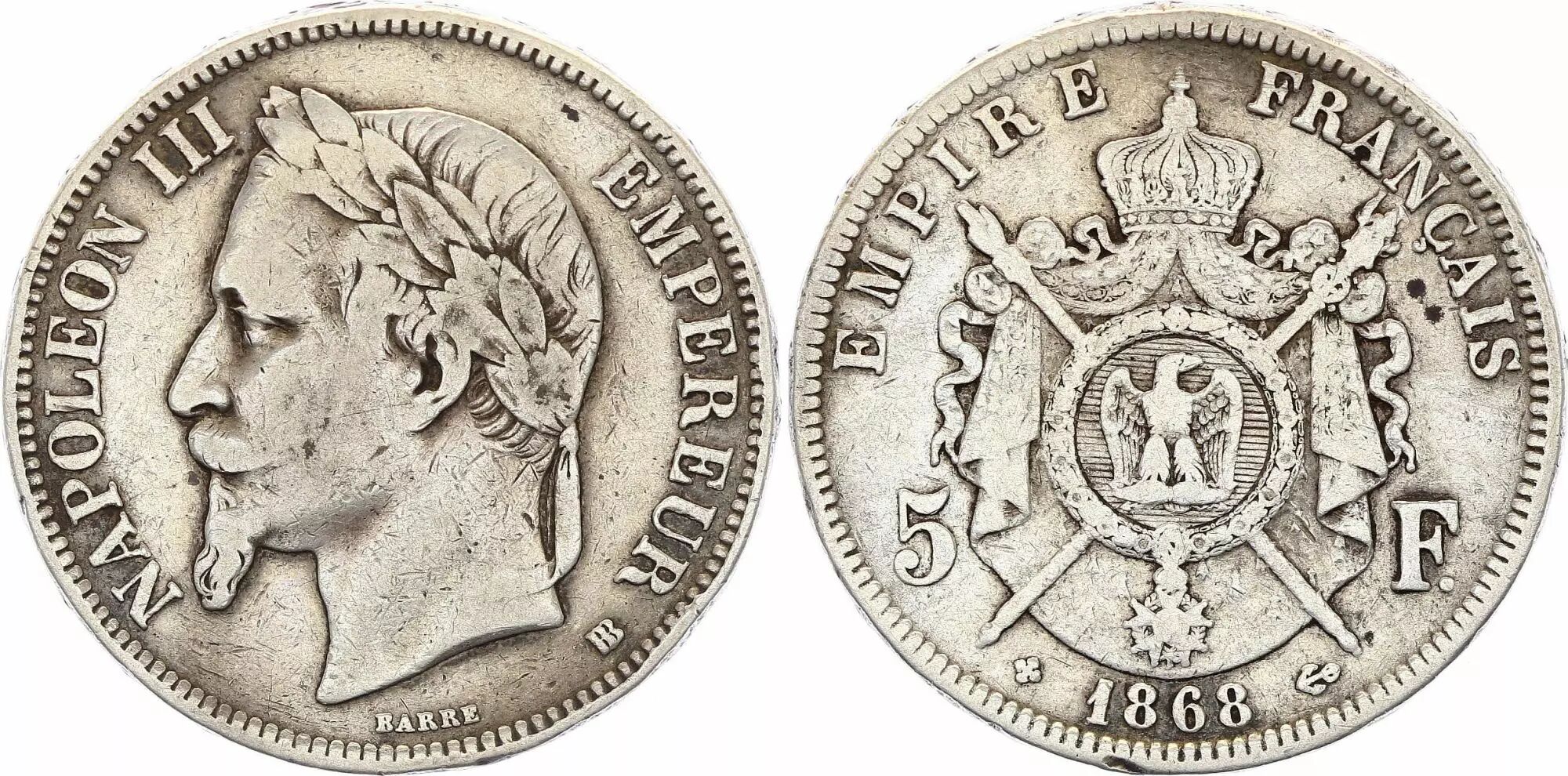 Home > French coins (470 à 2002) > Modern Currencies (1789 to 2002) > 5 Francs > France 5 Francs - Napoléon III - Laurelled Head - Strasbourg - 1868