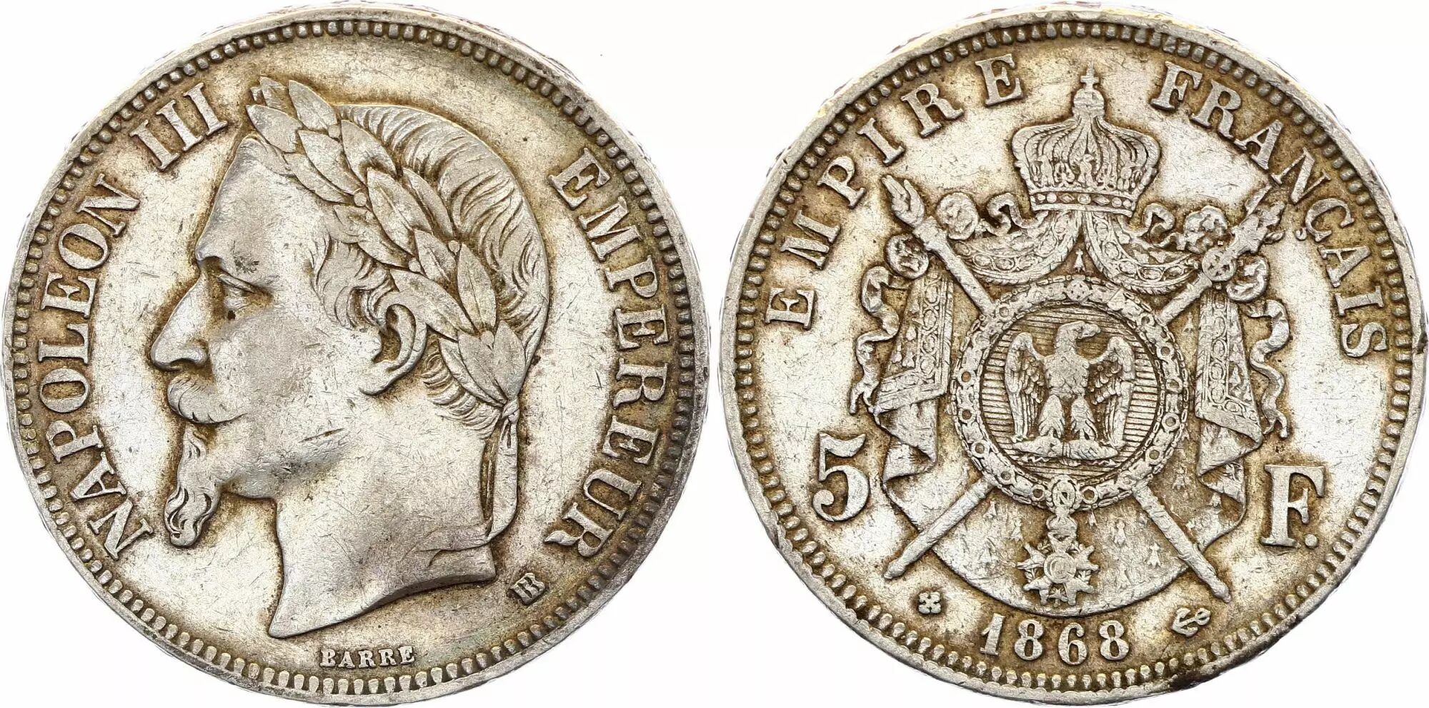 Pièce France 5 Francs - Napoléon III - Tête Laurée - 1868 BB