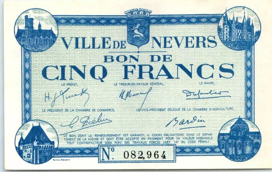 Banknote France 5 Francs , Nevers Bon de Ville, émis