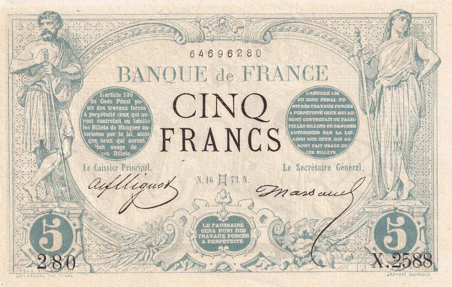 Accueil > Archivage > archivage-Billets Français > France 5 Francs - Noir - 16-05-1873 - Série X.2588 - F.01.18