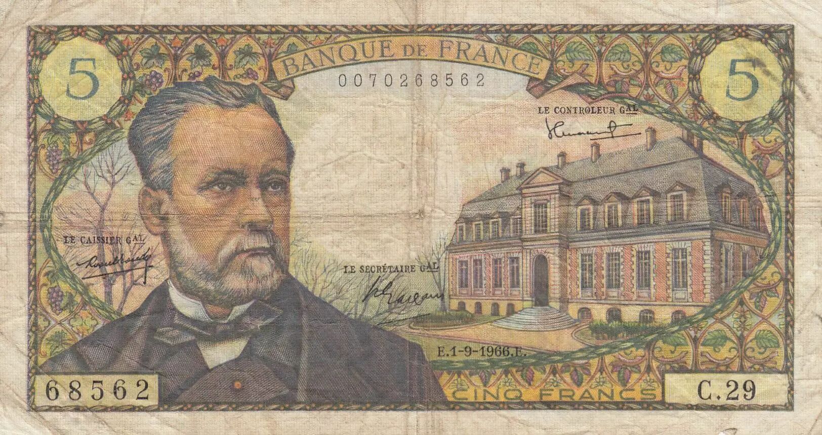 The 5 Francs Pasteur banknote, dated September 1, 1966, and bearing the series C.29, is a testament to French monetary history. Its dimensions are 140 millimeters in length and 75 millimeters in width.