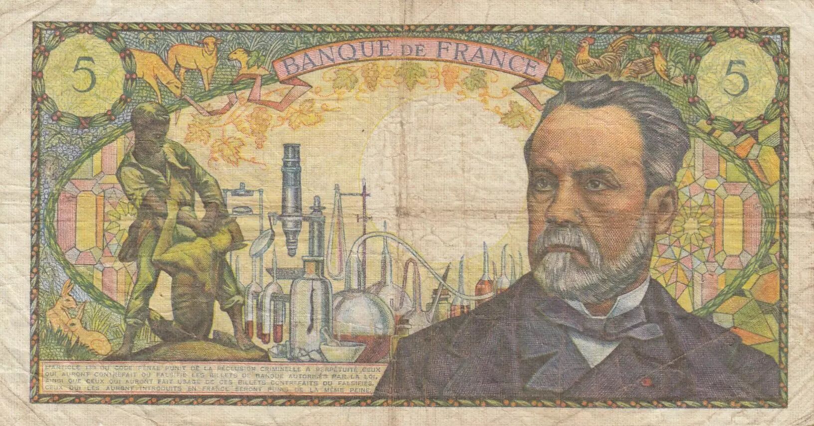 Le recto du billet présente un portrait de Louis Pasteur sur la gauche, tandis que l'Institut Pasteur est représenté sur la droite. Des motifs végétaux, notamment des grappes de raisin, ornent également cette face. On y retrouve la valeur nominale, "5", ainsi que la mention "BANQUE DE FRANCE" et "CINQ FRANCS". Le graveur de cette face est Gilbert Poilliot, et le dessinateur est Pierrette Lambert.