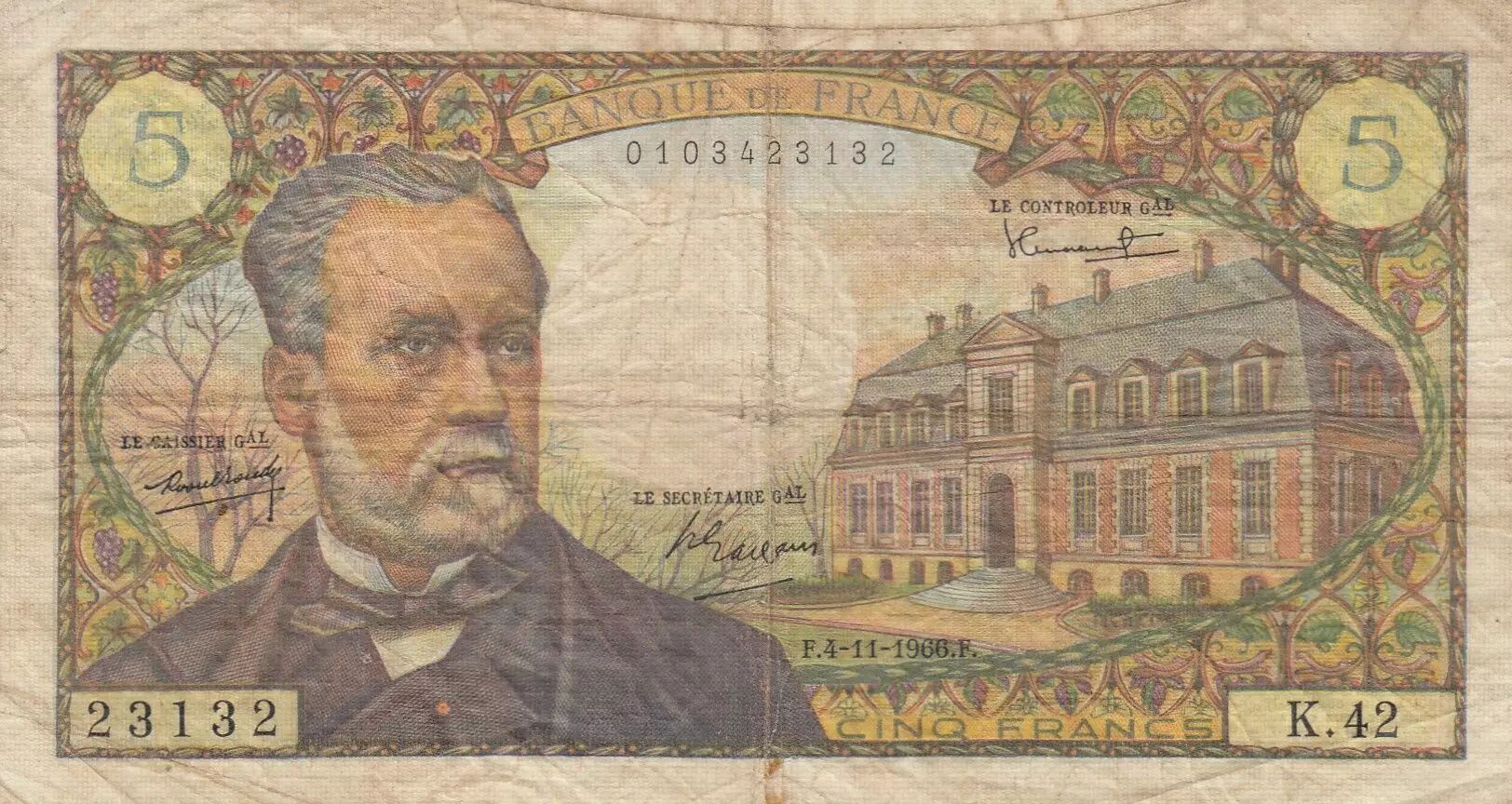 Ce billet de banque français d'une valeur nominale de 5 francs a été émis le 1er septembre 1966. Il appartient à la série K.42 et rend hommage à Louis Pasteur.