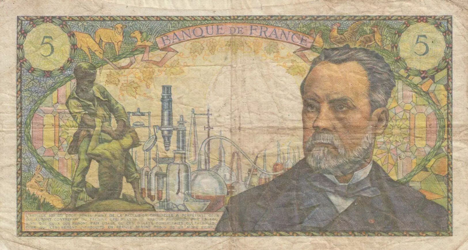 Au verso, on retrouve un autre portrait de Louis Pasteur, cette fois-ci sur la droite. À gauche, une statue du berger Jupille est visible. L'arrière-plan est composé d'éprouvettes, d'un microscope et de divers instruments scientifiques. Des lapins, des moutons et des coqs sont disposés dans les angles. Les inscriptions reprennent la valeur faciale "5" et la mention "Banque de France". Un extrait de l'article 139 du Code pénal est également inclus, rappelant les sanctions pour la contrefaçon et l'utilisation de faux billets. Pierrette Lambert a également conçu le verso, et la gravure a été effectuée par Henri Renaud.