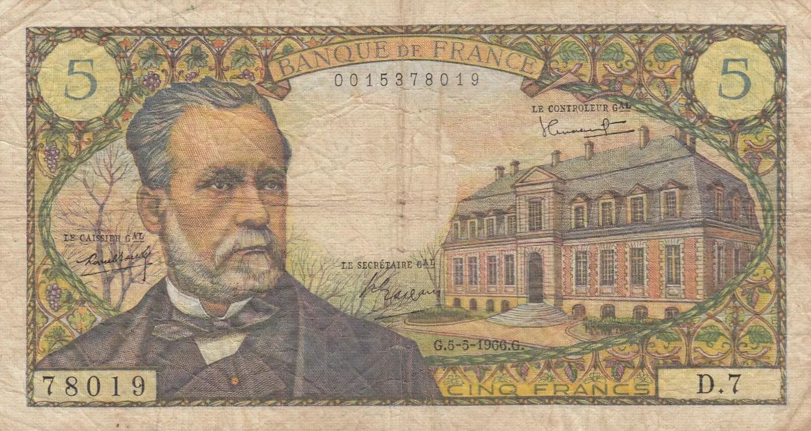 This French banknote has a face value of 5 francs. It was issued on May 5, 1966, and belongs to series D.7. Its dimensions are 140 mm in length and 75 mm in width.