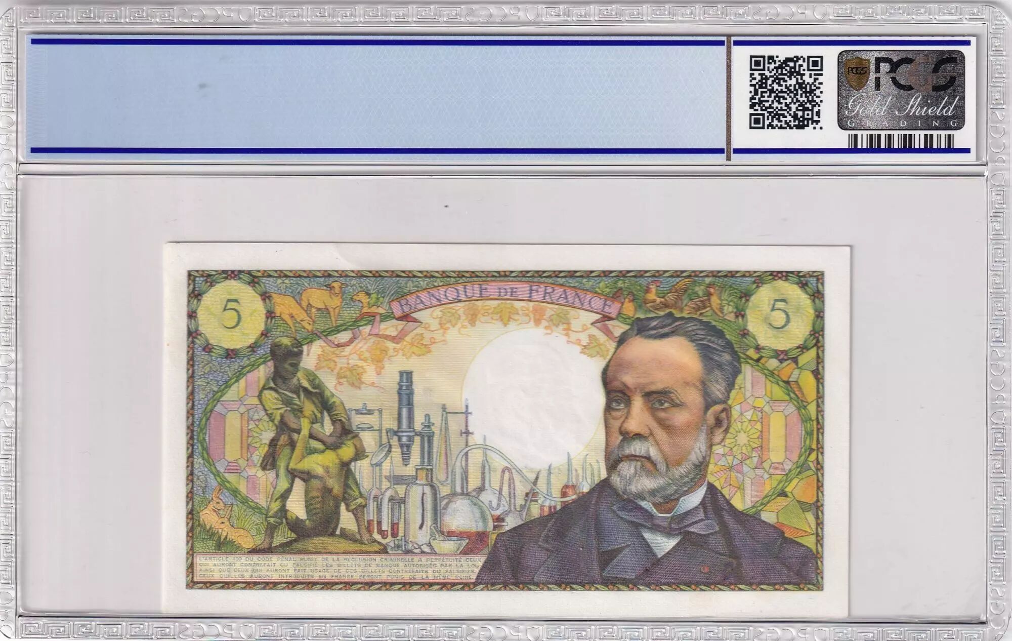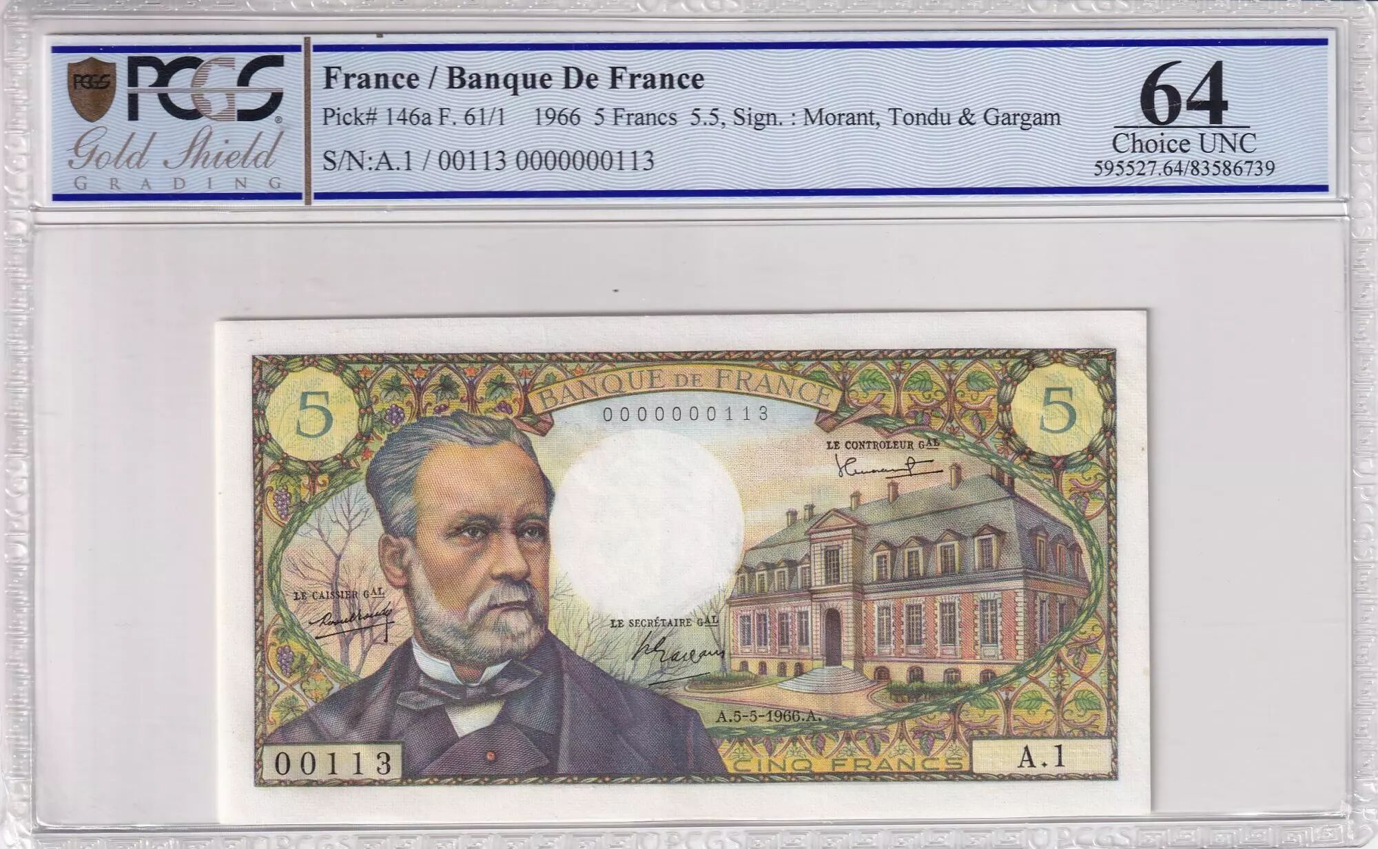Accueil > Archivage > France 5 Francs - Pasteur - 05-05-1966 - Série A.1 - Numéro 0000000113 - PCGS 64 - F.61.01A1