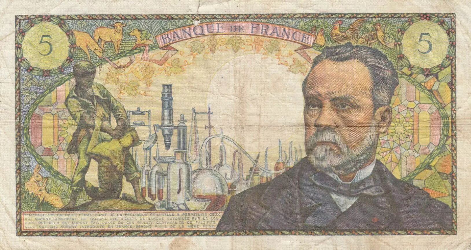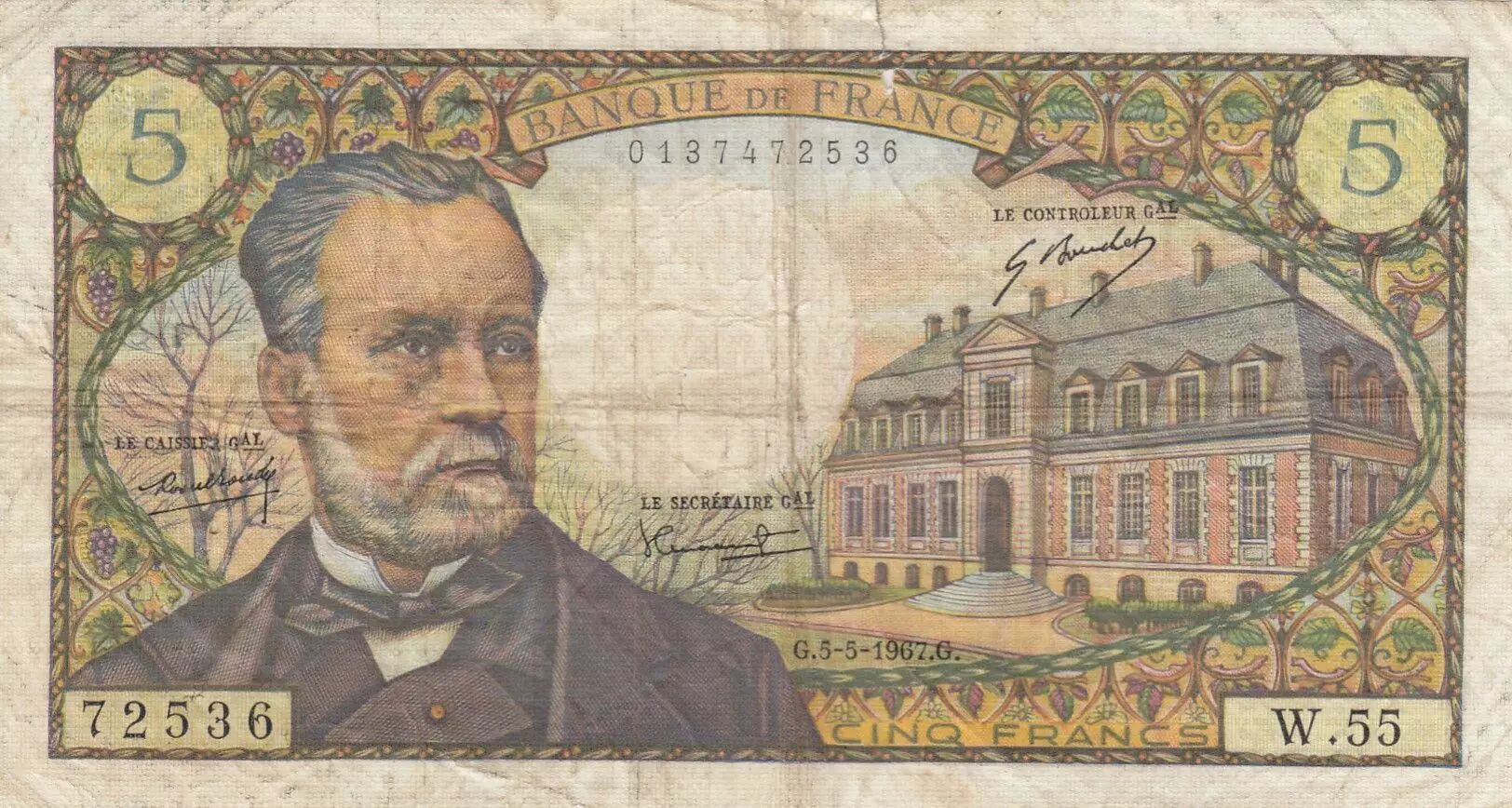 Le billet de 5 Francs, émis le 5 mai 1967, est un produit de la Banque de France, identifié par la série W.55. Il rend hommage à Louis Pasteur, scientifique français renommé.