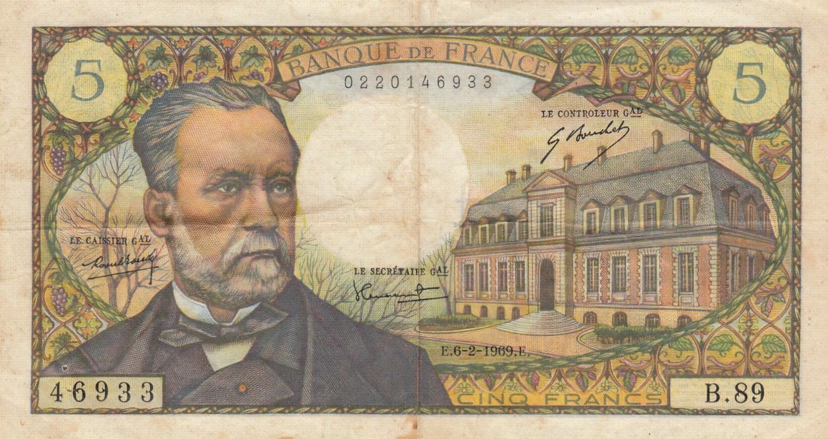 Ce billet de banque de France présente une valeur nominale de cinq francs. Il a été émis le 5 juin 1969 et fait partie de la série H.85.