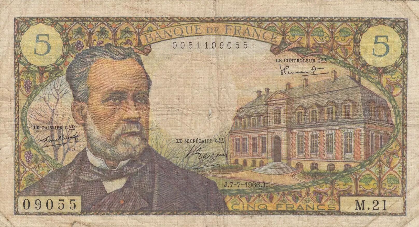 Le billet de 5 francs, type Pasteur, émis le 7 juillet 1966, porte la référence de série M.21. Ses dimensions sont de 140 mm de longueur pour 75 mm de largeur.