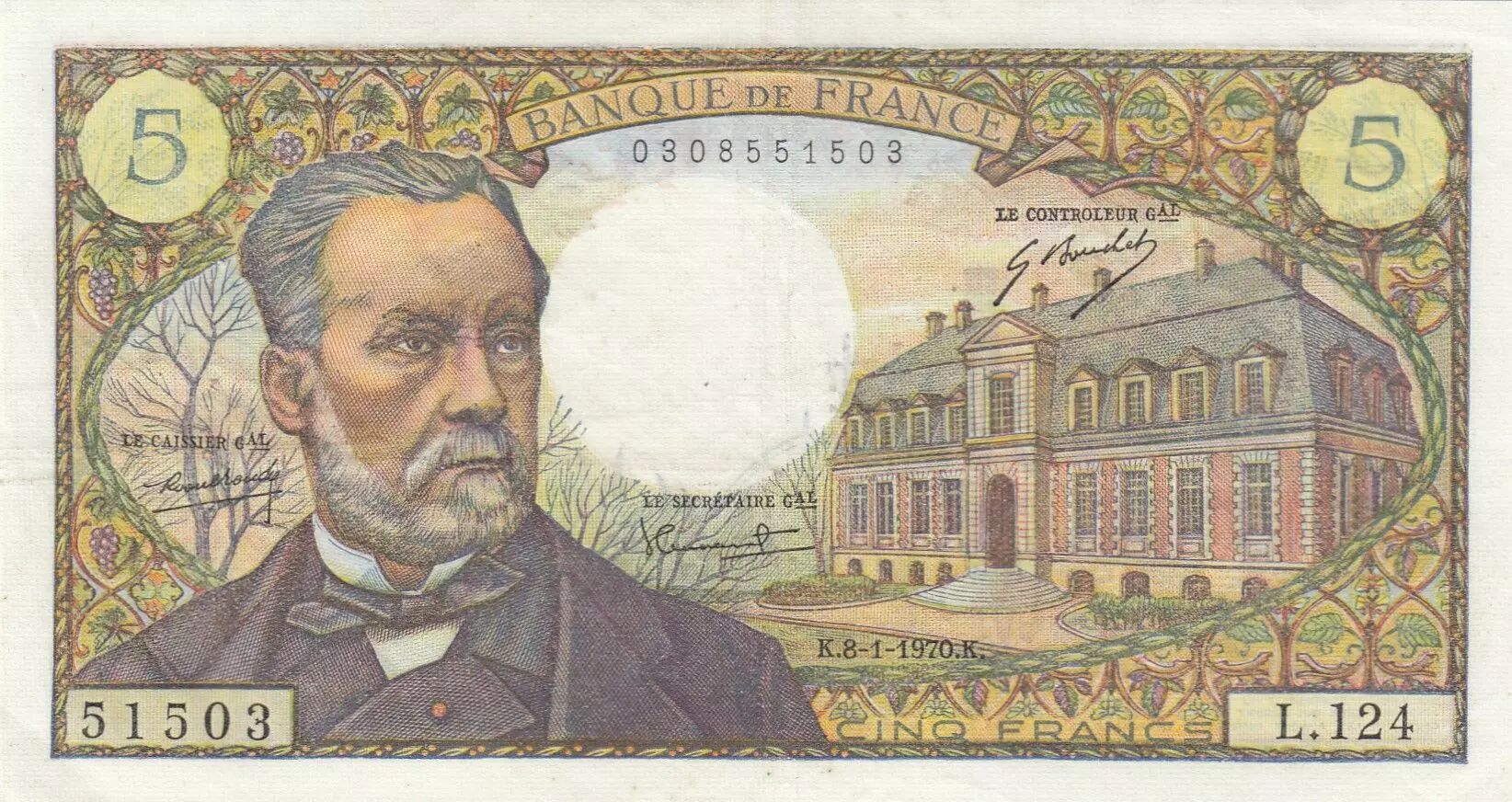 Banknote France 5 Francs - Pasteur - 08-01-1970 - Serial L.124