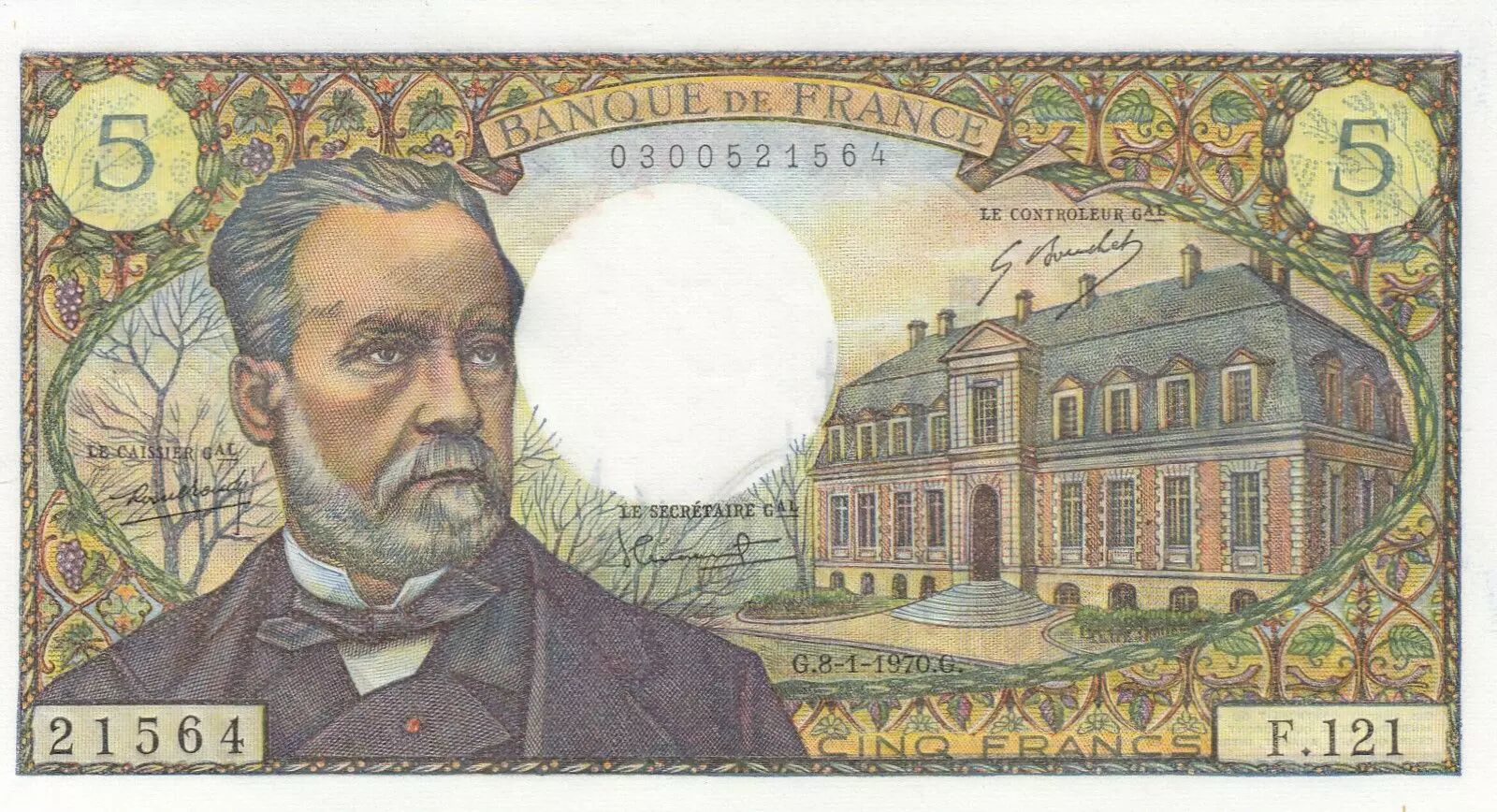 Ce billet de banque français a été émis le 8 janvier 1970. Il représente une valeur faciale de cinq francs. Il s'agit d'un billet de la Série O.119.