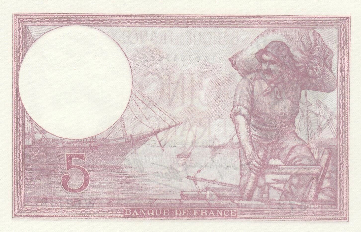 The obverse of the banknote features an allegory of France, represented by a draped female figure holding an olive branch, a symbol of peace and prosperity. The background consists of intricate ornamental motifs and the inscription "Banque de France". The face value, "5 Francs", is clearly indicated in words and numbers.