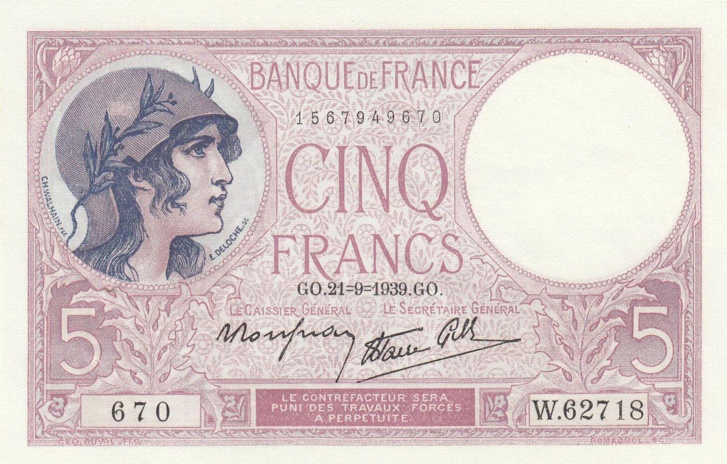 Ce billet de banque français a une valeur nominale de cinq francs. Il a été émis le 29 septembre 1939.