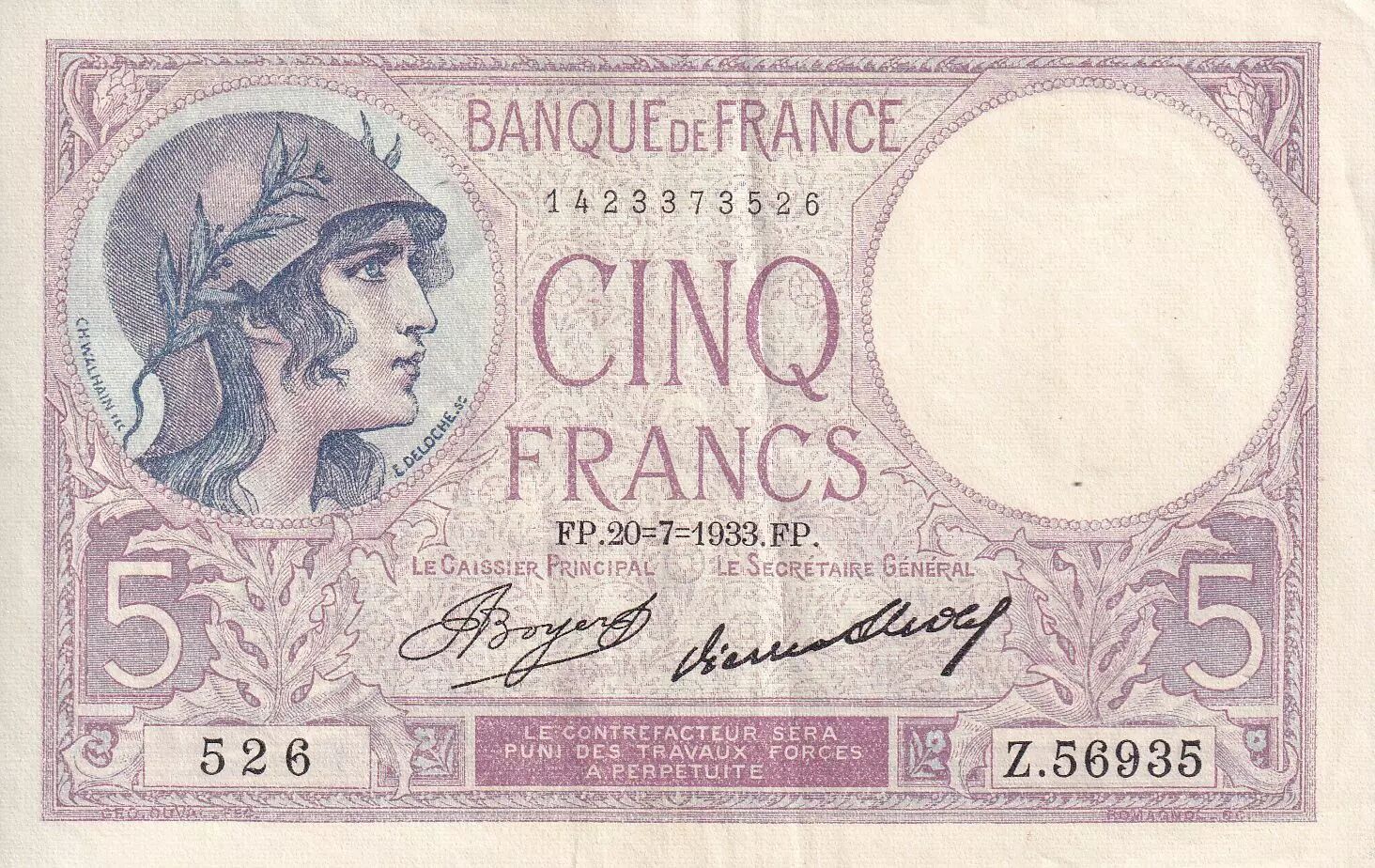 Home > > France 5 Francs - Purple - 04-05-1933 - Serial Z.56935 - P.79