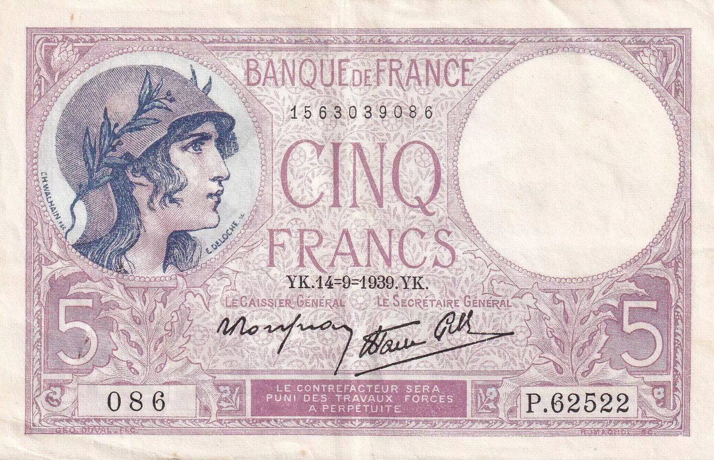 Banknote France 5 Francs - Purple - 14-09-1939 - Serial P.62522-086 - P.79