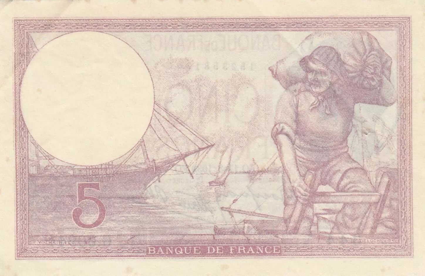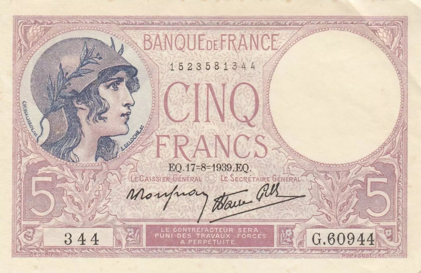 Banknote France 5 Francs - Purple - 17-08-1939 - Serial Série G.60944