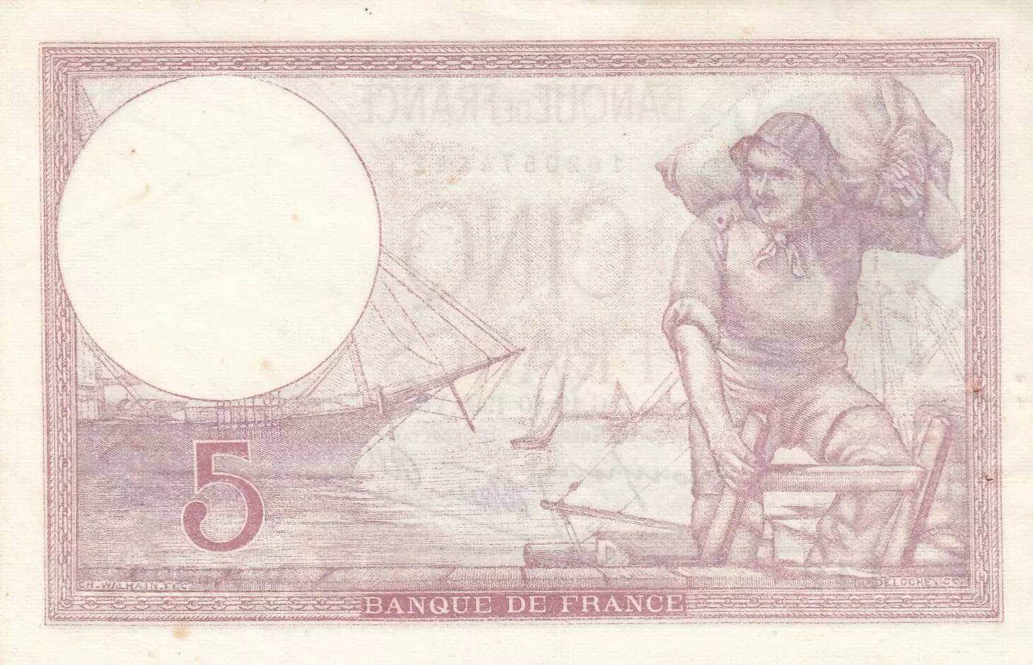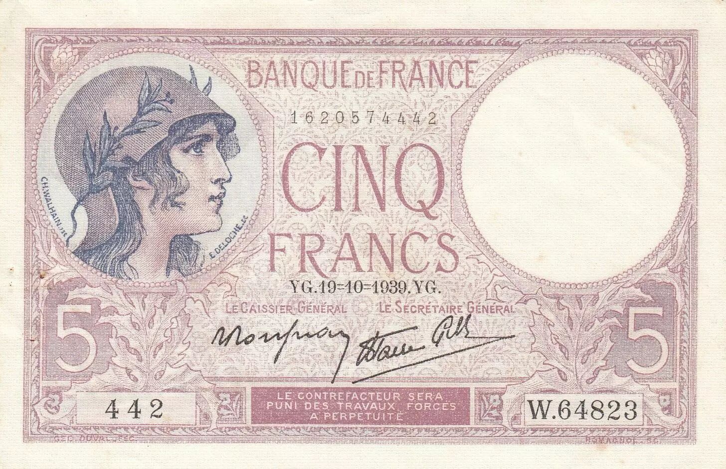 Banknote France 5 Francs - Purple - 19-10-1939 - Serial W.64823