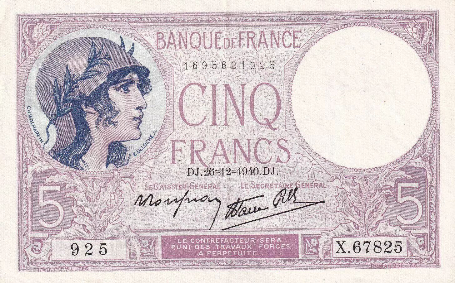 Home > > France 5 Francs - Purple - 26-12-1939 - Serial X.67825 - P.79