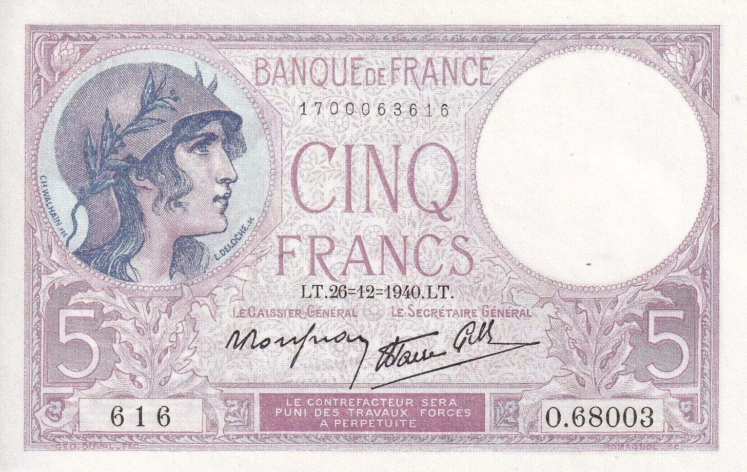 Home > > France 5 Francs - Purple - 26-12-1940 - Serial O.68003 - P.79