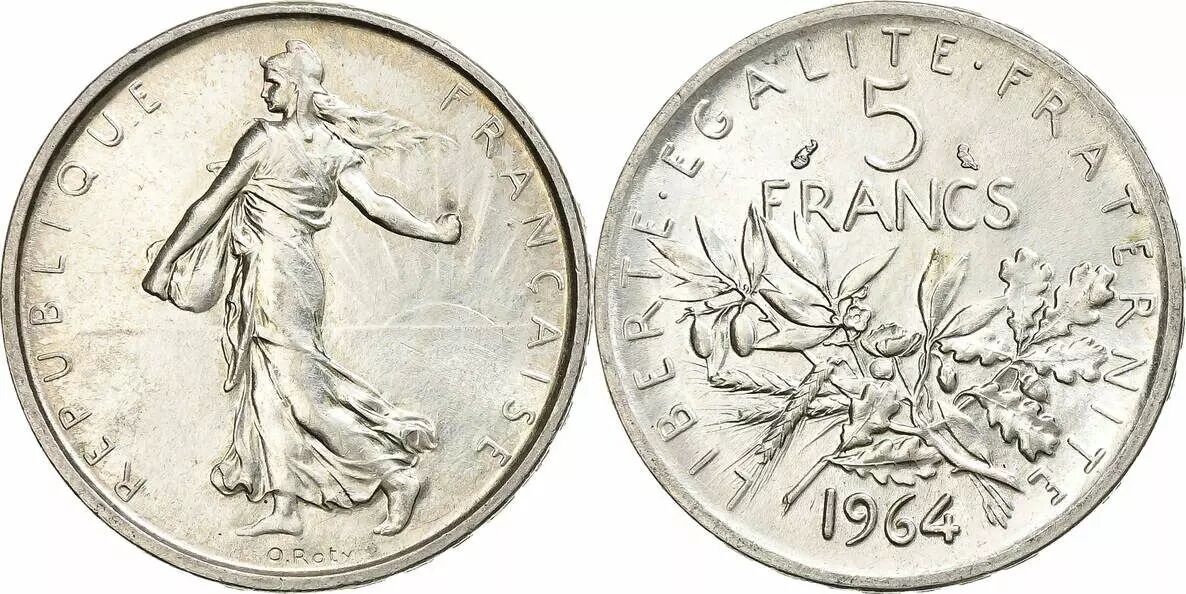 The 5 Francs Semeuse coin, minted in silver, is a French coin issued in 1964. Its face value is 5 francs.