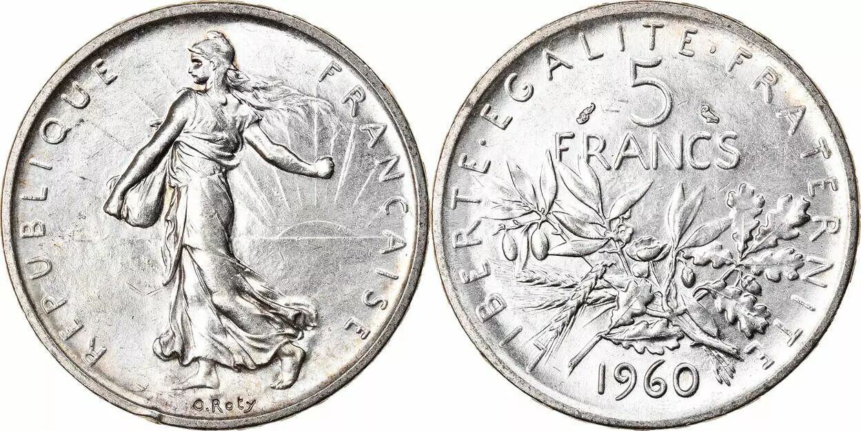 La pièce de 5 Francs Semeuse, frappée en argent, est une pièce de monnaie française émise en 1960. Elle a une valeur nominale de 5 francs.