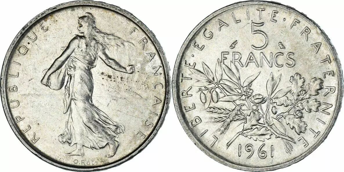 La pièce de 5 Francs Semeuse, frappée en argent, est une pièce de monnaie française émise en 1961. Sa valeur nominale est de 5 francs. Elle pèse 12 grammes et présente un diamètre de 29 millimètres.