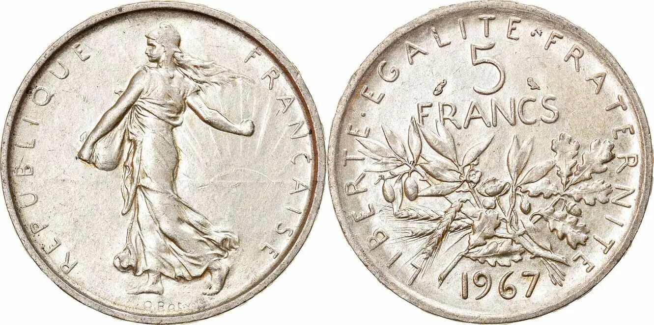 La pièce de 5 Francs Semeuse, frappée en argent, est une pièce commémorative émise par la France en 1967. Sa valeur nominale est de 5 francs.