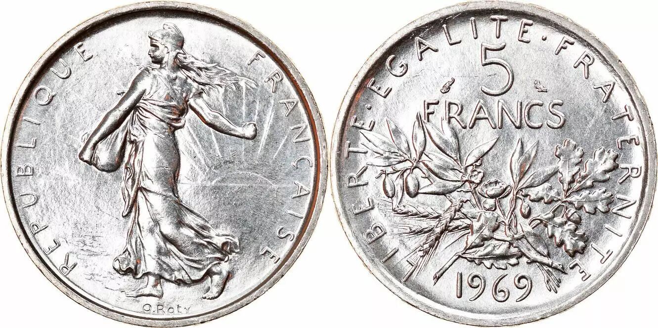 La pièce de 5 Francs Semeuse, frappée en argent, est une pièce de monnaie française émise en 1966. Sa valeur nominale est de 5 francs. Le poids de cette pièce est de 12 grammes et son diamètre mesure 29 millimètres.