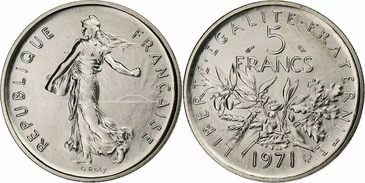 La pièce de 5 Francs Semeuse, datée de 1971, est une pièce de monnaie française. Sa valeur nominale est de 5 francs.