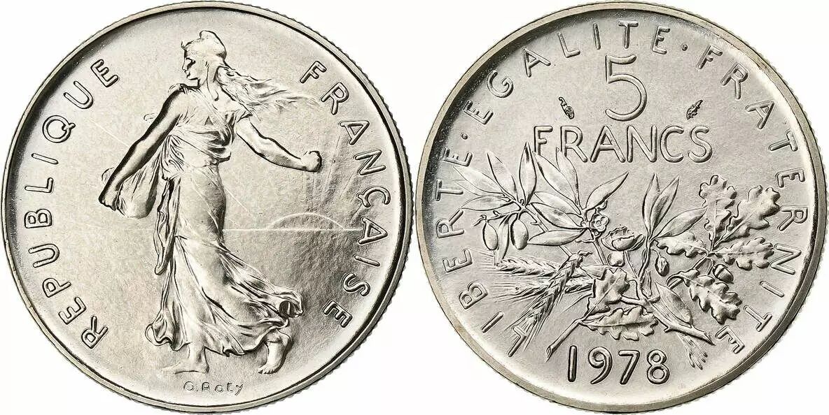 Le revers de la pièce présente un arrangement de symboles végétaux : une branche d'olivier, une branche de chêne et un épi de blé. Ces éléments sont disposés sous la valeur faciale "5 FRANCS". La devise nationale "LIBERTE ? EGALITE ? FRATERNITE" encercle cet ensemble végétal. L'année d'émission, 1978, est inscrite en bas de la pièce. La signature du graveur, Louis-Oscar Roty, est également présente.