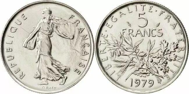 La pièce de 5 Francs Semeuse, frappée en France en 1979, est une pièce de monnaie d'une valeur nominale de 5 francs. Elle est composée de cuivre et de nickel, lui conférant une couleur argentée.