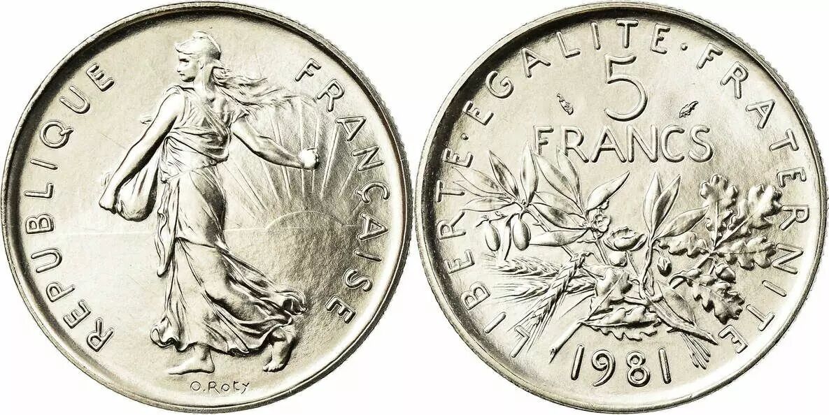 La pièce de 5 Francs Semeuse, frappée en France en 1981, est une pièce de monnaie d'une valeur nominale de 5 francs. Elle est composée de cuivre et de nickel, lui conférant une couleur argentée. La pièce pèse 10 grammes et a un diamètre de 29 millimètres.