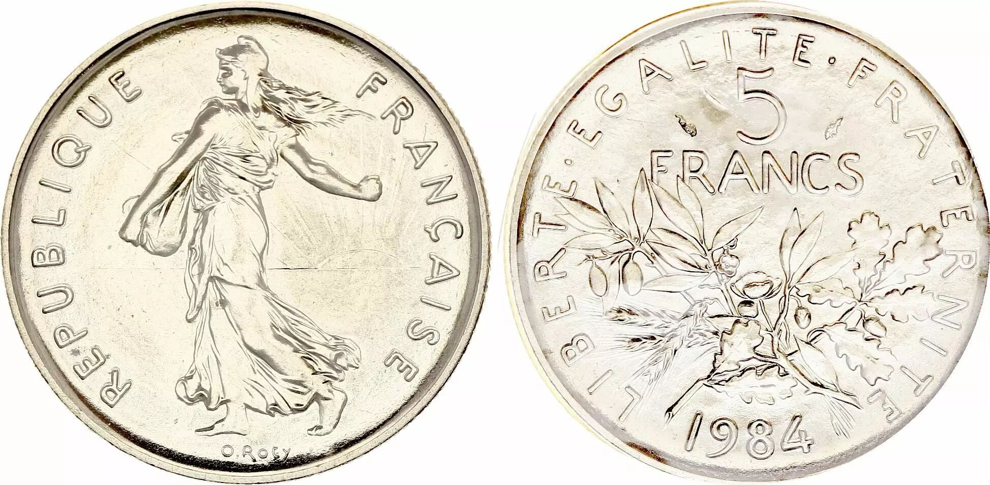 Le revers de la pièce met en scène un ensemble de symboles végétaux, comprenant une branche d'olivier, une branche de chêne et un épi de blé. Ces éléments représentent respectivement la paix, la force et la prospérité. La valeur faciale "5 FRANCS" est placée au-dessus de ces symboles. La devise nationale "LIBERTE ? EGALITE ? FRATERNITE" encercle la composition, rappelant les valeurs fondamentales de la République Française.