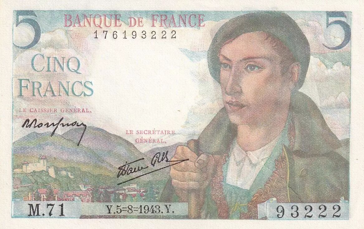 Banknote France 5 Francs Shepherd - 05-08-1943 - Serial M.71 - P.98