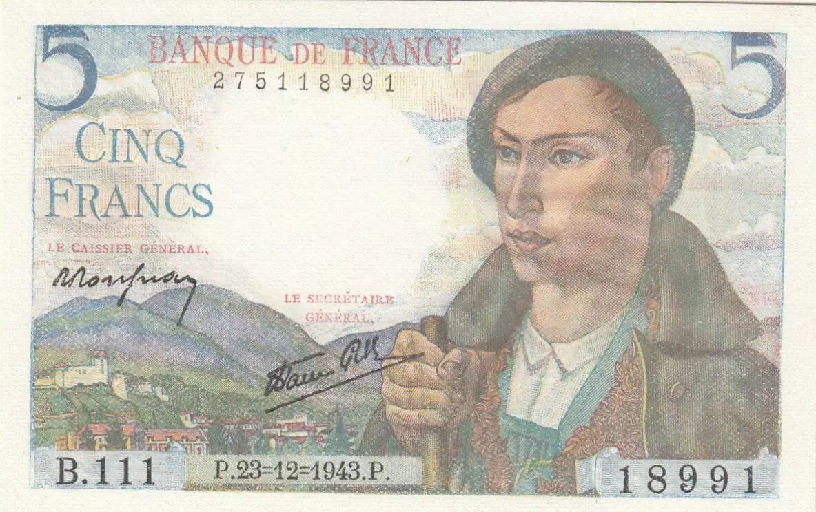 Banknote France 5 Francs - Shepherd - 23-12-1943 Serial B.111