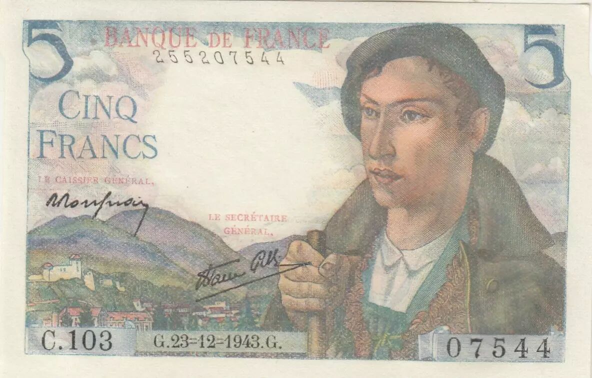 Home > French Banknotes > Bank of France Banknotes > 5 Francs Banknotes > Berger Type 1943 (1943-1947) > France 5 Francs - Shepherd - 23-12-1943 - Serial C.103 - PROMO