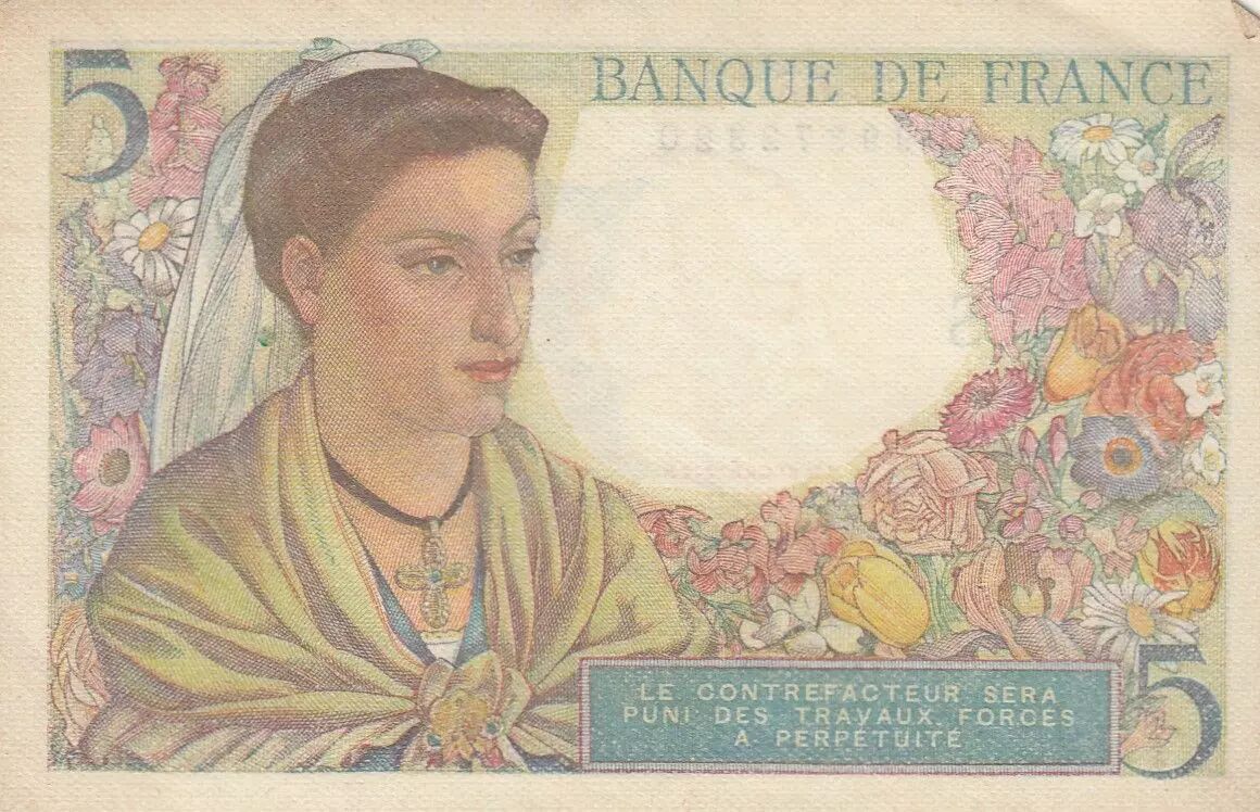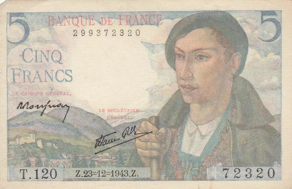 Banknote France 5 Francs - Shepherd - 23-12-1943 - Serial T.120
