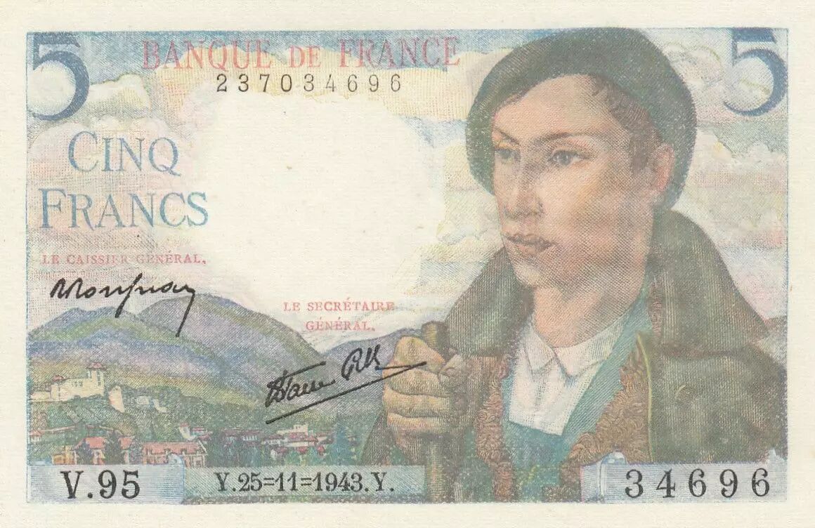 Banknote France 5 Francs - Shepherd - 25-11-1943 - Serial V.95