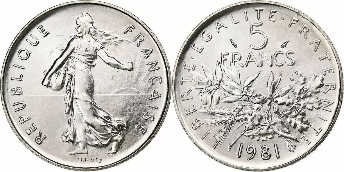 This 5 Francs coin, minted in 1981, comes from a Brilliant Uncirculated (FDC) set. It is made of cupronickel, weighing 10 grams and measuring 29 millimeters in diameter.
