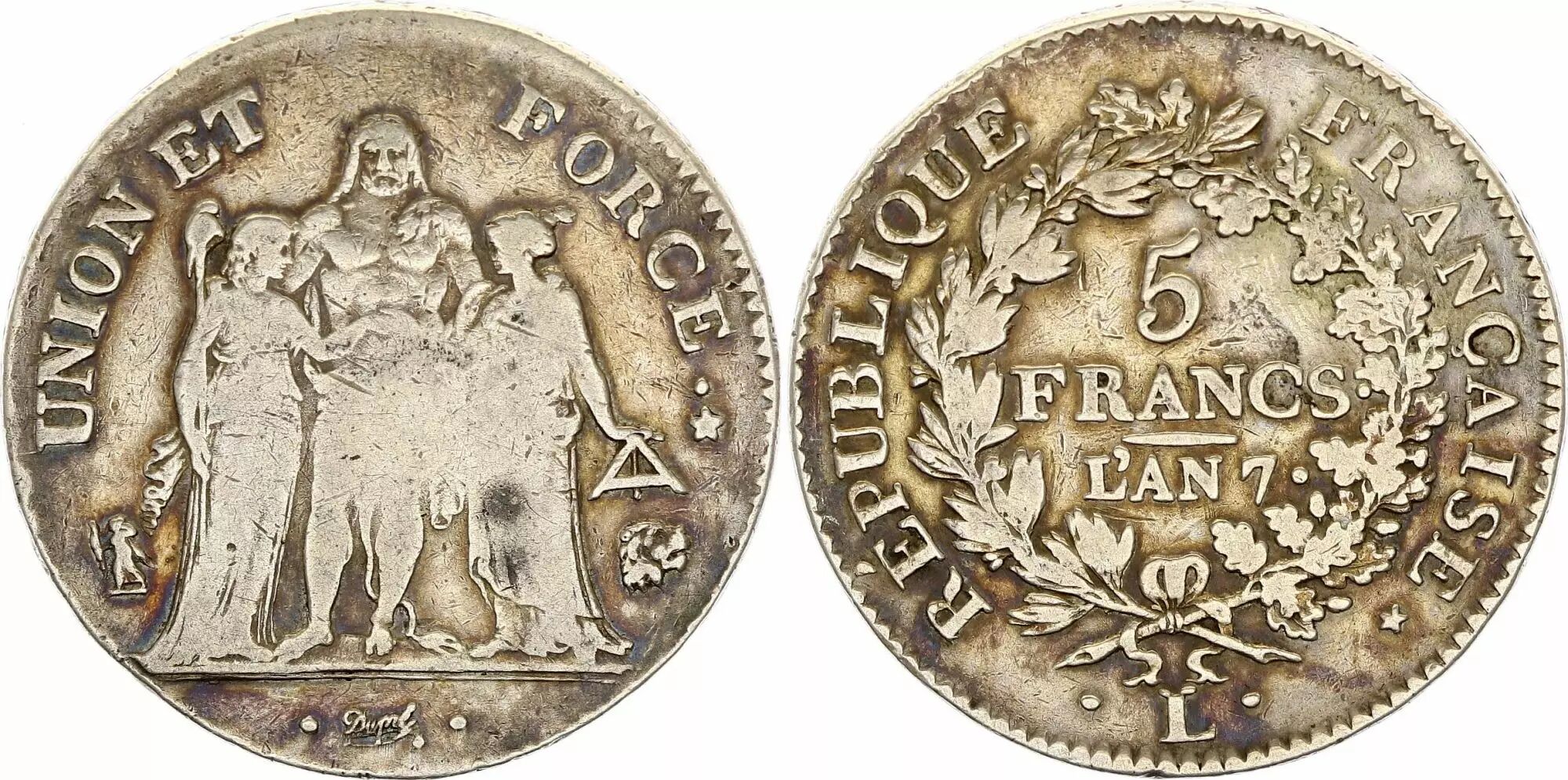 Accueil > Archivage > archivage-Monnaies françaises (470 à 2002) > France 5 Francs Union et Force - An 7 L Bayonne