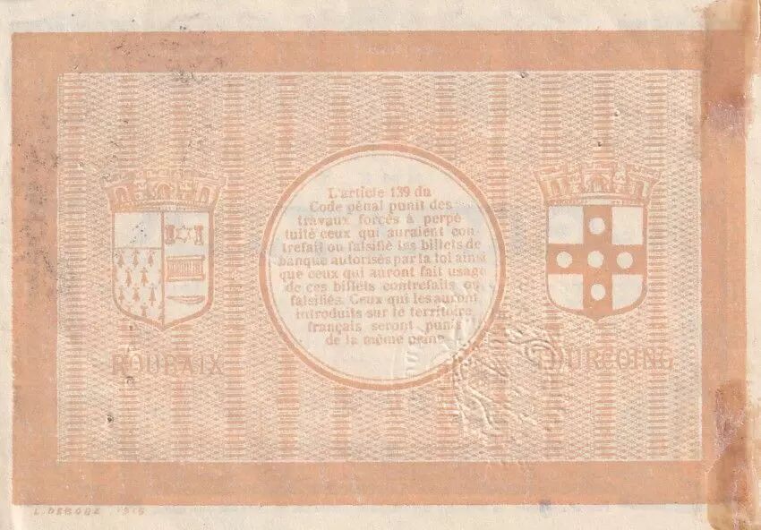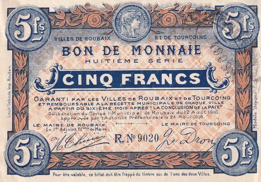 Le billet est spécifique aux villes de Roubaix et Tourcoing, situées dans le département du Nord (numéro 59). Il fait partie de la 8ème série, portant le numéro 9020. Il comporte deux signatures.