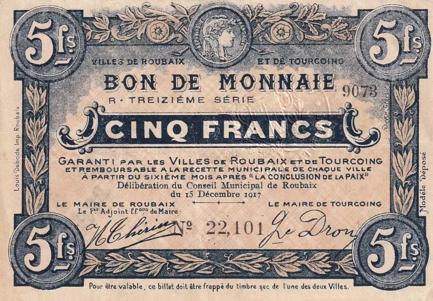 This type of banknote testifies to the monetary adaptations put in place by local authorities to compensate for the lack of liquidity and facilitate economic transactions within the populations. The association of the cities of Roubaix and Tourcoing for this issue highlights inter-municipal cooperation in the face of the economic challenges of the time.